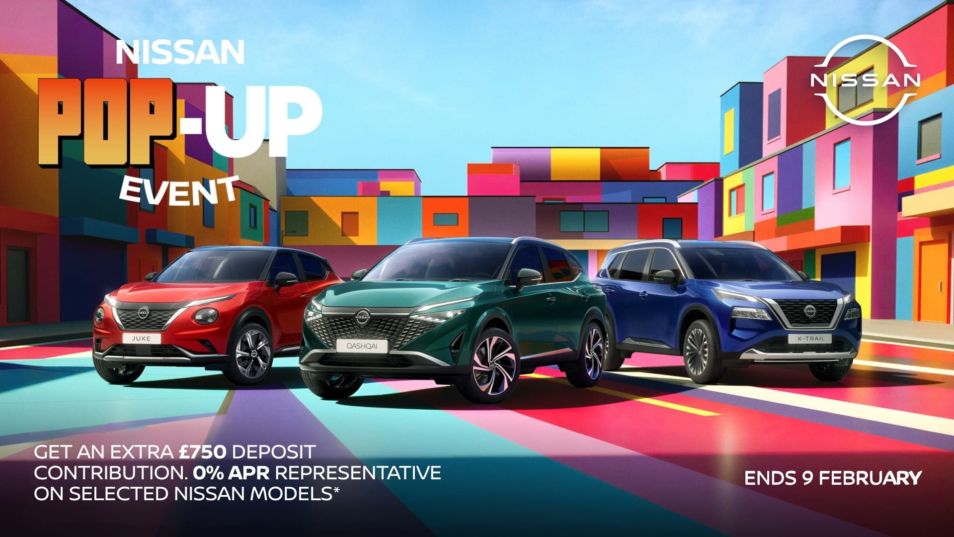 *Offer valid from 8th January 2026 until 9th February 2026 at participating dealers only and subject to vehicle availability. To be eligible, vehicles must be ordered by 9th February 2026 and registered by 31st March 2026. Finance provided by Nissan Financial Services, Rivers Office Park, Denham Way, Maple Cross, Rickmansworth, WD3 9YS. Subject to status. Guarantees and indemnities may be required. You must be at least 18 and a UK resident (excluding the Channel Islands). ADDITIONAL NISSAN DEPOSIT CONTRIBUTION OF £750 IS ONLY AVAILABLE WHEN TAKEN ON 24-36 MONTH 0% APR REPRESENTATIVE PCP NISSAN FINANCIAL SERVICES PRODUCT. Applies to: Qashqai (all models); Juke (except N-Sport); ARIYA (NISMO only); and X-Trail (except e-POWER grades; e-4ORCE (Acenta Premium, N-Connecta, N-Trek, Tekna, Tekna+) . 30% MINIMIUM DEPOSIT REQUIRED ON QASHQAI, X-TRAIL AND JUKE. ARIYA NISMO 0% APR REQUIRES 36-48 MONTH TERM. Offer based on 8,000 miles pa, excess mileage 8p per mile. Offers not available in conjunction with any schemes or other offers. Vehicle price includes first registration fee and 12 months’ road fund licence. Nissan reserves the right to amend or withdraw offers at any time without prior notice, including in the case of any events or circumstances beyond Nissan’s reasonable control. Terms and conditions apply. Please refer to your local authorised Nissan dealer for further information and exact specifications. Your Nissan dealer is a credit broker and not a lender and can introduce you to a limited number of lenders and their finance products. You must decide whether the finance product is right for you. Lenders will typically pay commission to your Nissan dealer, being either a fixed fee or a fixed percentage of the amount you borrow. Commission rates between lenders could vary, but the commission received by your Nissan dealer does not influence the interest rate you will pay.