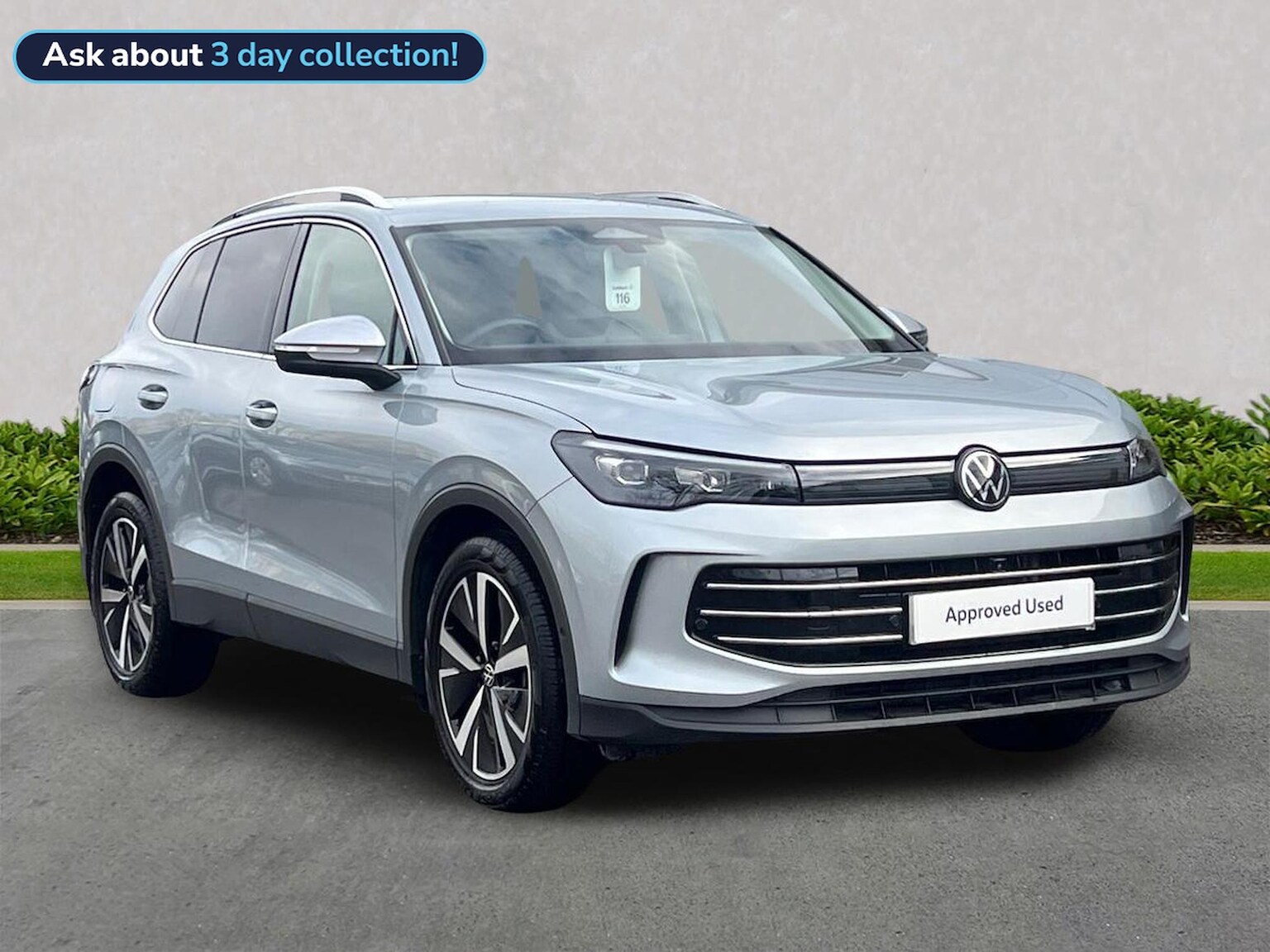 VOLKSWAGEN TIGUAN 1.5 eTSI 150 Elegance 5dr DSG Mileage: 10,387 Miles A beautifully specified Volkswagen Tiguan Elegance, finished in Oyster Silver Metallic with a refined Mistral-Soul Black interior. This premium SUV delivers a perfect balance of performance, comfort and advanced technology, powered by the smooth and efficient 1.5 eTSI mild-hybrid engine paired with a 7-speed DSG gearbox. With features such as 360° Area View, Adaptive Cruise Control, and voice-controlled navigation, this Tiguan ensures every journey is confident, comfortable and connected. Vehicle Specification (Standard & Optional Equipment) 19" Catania alloy wheels (Black diamond-turned finish) Area View 360° and Rear View Camera Adaptive Cruise Control (ACC) with Front Assist and Pedestrian/Cyclist Monitoring Lane Assist, Side Assist, Travel Assist & Emergency Assist Oncoming Vehicle Braking & Swerve Support Dynamic Road Sign Display with Predictive Speed Limiter Heated, power-folding door mirrors with memory and surround lighting Keyless Access and Start IDA Voice Assistant with Discover Navigation System Wireless smartphone charging Inductive mobile phone interface Front and rear USB-C ports Front Cross Traffic Assist ISOFIX child seat preparation (front and outer rear) Rear tinted glass from B-pillar backwards Dual-zone Air Care Climatronic air conditioning 3-point seat belts with front pre-tensioners and rear ISOFIX anchors Driver and front passenger airbags with deactivation switch Ambient interior lighting Elegant chrome detailing and body-coloured styling Volkswagen Approved Used Benefits Standard Cover with an Approved Used Purchase: ? 1 Year Volkswagen Warranty ? 1 Year Roadside Assistance When Financed with Solutions PCP from Volkswagen Financial Services (Petrol, Diesel & Plug-in Hybrid models): ? 2 Services included (worth £522) ? 2 Years’ Volkswagen Warranty† (worth £284) ? 2 Years’ Roadside Assistance† (worth £120) ? £250 Deposit Contribution (subject to vehicle age and finance terms)* Total Value of PCP Added Extras: £926 (*Eligibility and finance terms apply)
