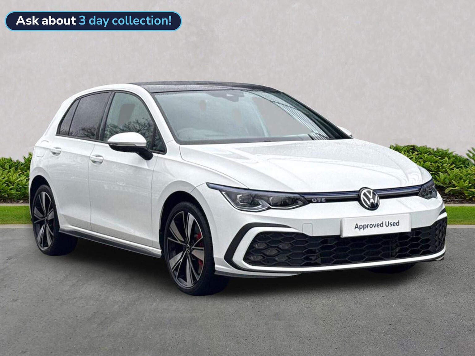 Volkswagen Golf GTE 1.4 TSI Plug-in Hybrid DSG Registration: AO72 YGR Mileage: 25,000 miles Power Output: 245 PS Transmission: DSG Automatic Fuel Type: Petrol Plug-in Hybrid Emissions Standard: Euro 6 (s/s) Vehicle Description This Volkswagen Golf GTE blends strong performance with efficient plug-in hybrid technology, delivering 245 PS through a smooth DSG automatic gearbox. Finished in Pure White with distinctive GTE styling, it offers a premium driving experience with advanced technology, comfort features and intelligent driver assistance. Ideal for drivers wanting electric capability for short journeys without compromising long-distance usability. Key Features Exterior & Styling Pure White paint finish 18" Bakersfield alloy wheels Panoramic glass sunroof IQ.LIGHT LED Matrix headlights LED rear lights with dynamic indicators Rear privacy glass Interior & Comfort GTE interior with Soul Black and blue accents Heated front and outer rear seats Heated leather multifunction sports steering wheel with paddles Three-zone Air Care Climatronic climate control Ambient interior lighting Light & Sight Pack with auto-dimming mirror Technology & Infotainment Discover Media Navigation system Wireless App-Connect (Apple CarPlay / Android Auto) Head-Up Display Digital road sign display Driver Assistance & Safety Adaptive Cruise Control (ACC) Travel Assist with Lane Assist and Emergency Assist Side Assist with Rear Traffic Alert and Exit Warning Front Assist with Autonomous Emergency Braking Proactive passenger protection system Rear view camera Dynamic Chassis Control (DCC) with driving modes Keyless entry and start Anti-theft alarm system Volkswagen Approved Used Benefits (2026) Finance your Volkswagen with Solutions PCP and enjoy: Up to 2 years’ Servicing for only £99¹ 1 year Volkswagen Warranty² 1 year Roadside Assistance² Plus a whole load of peace of mind Deposit Contributions with Solutions PCP £250 deposit contribution on vehicles aged 0–12 months³ £250 deposit contribution on vehicles aged 13–36 months³ Electric Vehicle Offers £325 deposit contribution on ID. models aged 3 years and over³ Important Information ¹ Available on all vehicles up to 8 years old. Covers two consecutive services for Petrol, Diesel and eHybrid vehicles. Servicing for Battery Electric Vehicles also includes 1 MOT. Volkswagen Finance. ² Valid for vehicles up to 100,000 miles and less than 8 years old at point of activation. Offer subject to change or removal at any time. Accurate at 01/26. ³ Ordered by 31/03/2026. Indemnities may be required. Offer subject to change or removal at any time. Excludes Volkswagen Commercial Vehicles. Volkswagen Finance.